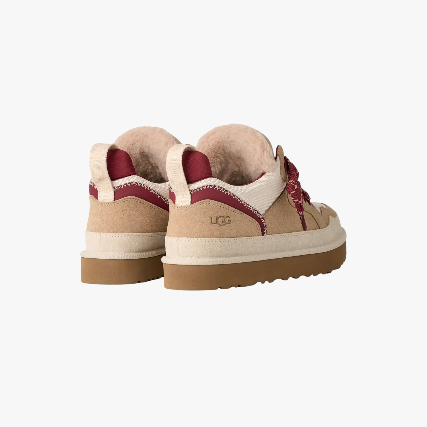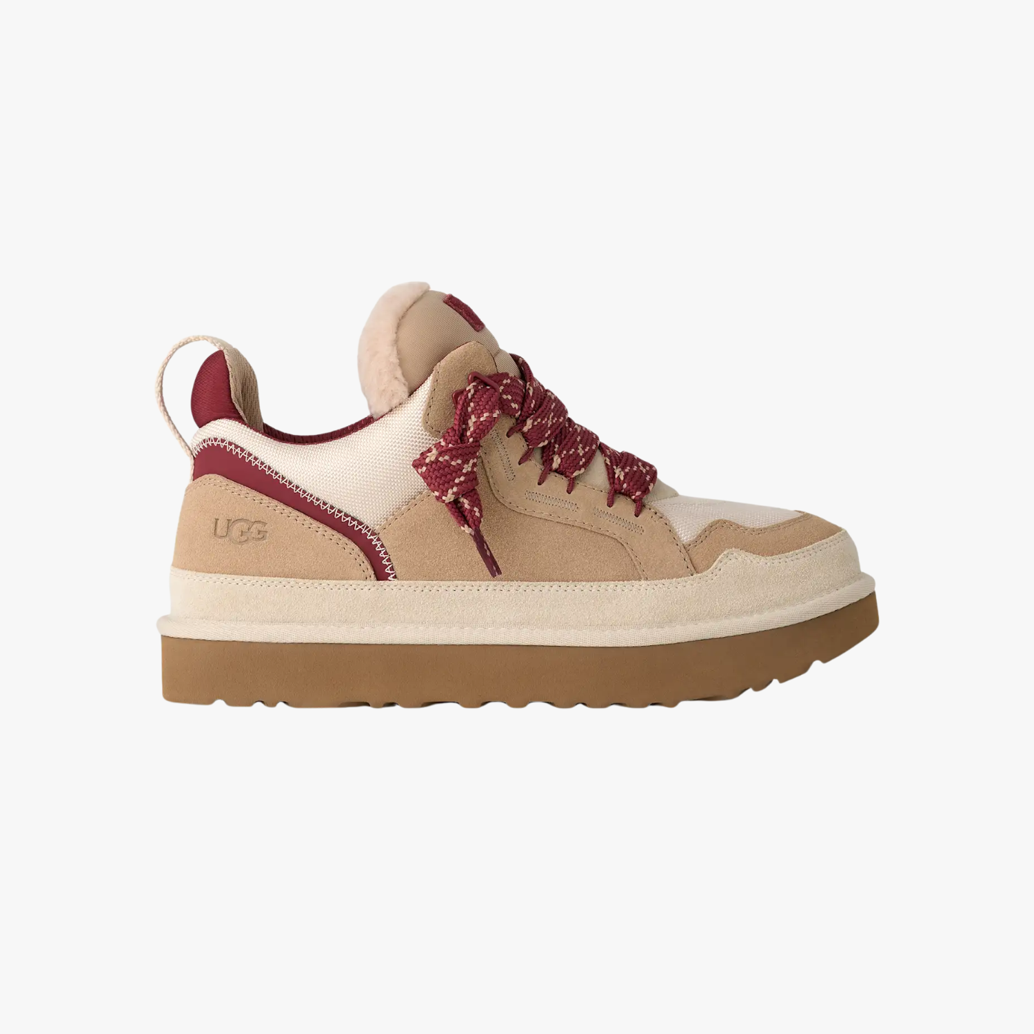 The UGG Lowmel in "Driftwood Biking Red" is a modern, gender-neutral style that blends the comfort technology of a slipper with the silhouette of a street-ready sneaker. The shoe features an upper crafted from a rich suede or nubuck in a light, versatile Driftwood (sandy brown) shade. This neutral body is boldly accented by high-impact Biking Red detailing, typically found on the collar, stitching, or trim, creating a stylish and striking contrast. The interior is lined with UGG's signature UGGplush™ upcycled wool blend, ensuring exceptional comfort. The style is finished with a lightweight, durable outsole, such as SugarSole™, which provides cushioning and makes it suitable for all-day indoor and outdoor wear.